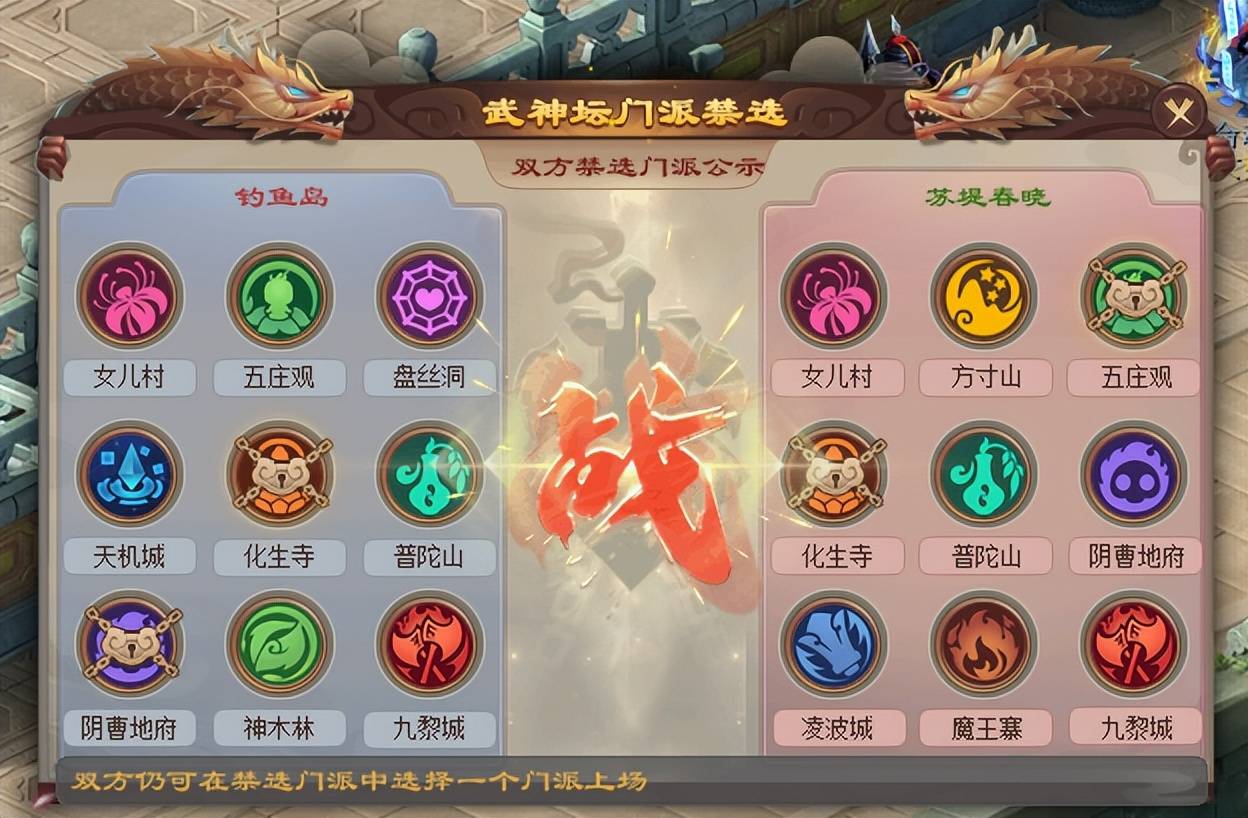 禁选环节,钓鱼岛被禁化生、地府,苏堤春晓被禁化生、五庄。单就禁选情况来说,如果双方均选择化生寺的话,钓鱼岛不能使用咒师体系的点杀阵容,苏堤春晓则在使用双封或者四保一阵容时没有五庄保九黎。