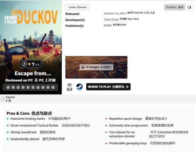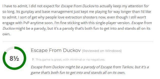 《逃离鸭科夫》在延续可爱画风的同时实现了诸多亮点,但其过长的游戏时长与单薄的刺激反馈形成反差。游戏最显著的缺陷在于借鉴了一款本质存在缺陷、仅凭机缘走红的作品。若能保留《逃离塔科夫》的沉浸氛围并彻底重构任务体系,本有望成为惊艳之作。现阶段这款充满致敬精神的游戏虽不乏趣味片段,却因内容重复性高而逐渐消磨玩家耐心,不过其亲民定价仍可谓物有所值。