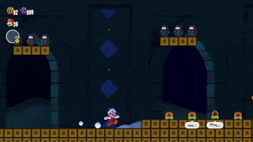 在《惊奇》里,任天堂下了不少工夫给玩家制造“惊奇”。除了精彩的2D关卡设计与多样的道具之外,让玩家最为惊奇的就是30多年都没啥台词的马力欧系列居然出现了一个/群能说话的角色。这角色不开口则已,一开口还是个话唠,有一种要把系列30年没说的话一口气补完的气势。
