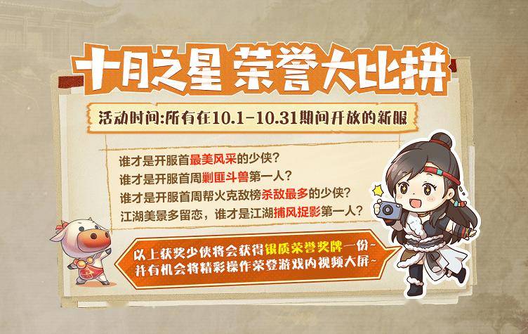 与此同时,我们将特别启动“十月之星”荣誉评选。在新服开启的首周,于以下四大领域位居第一的少侠:展现最美风采剿匪斗兽第一人、位居帮火克敌榜榜首、成为江湖捕风捉影第一人,将分别荣获专属定制纪念证书。以此铭刻少侠在天龙江湖的高光时刻,留存永恒纪念。
