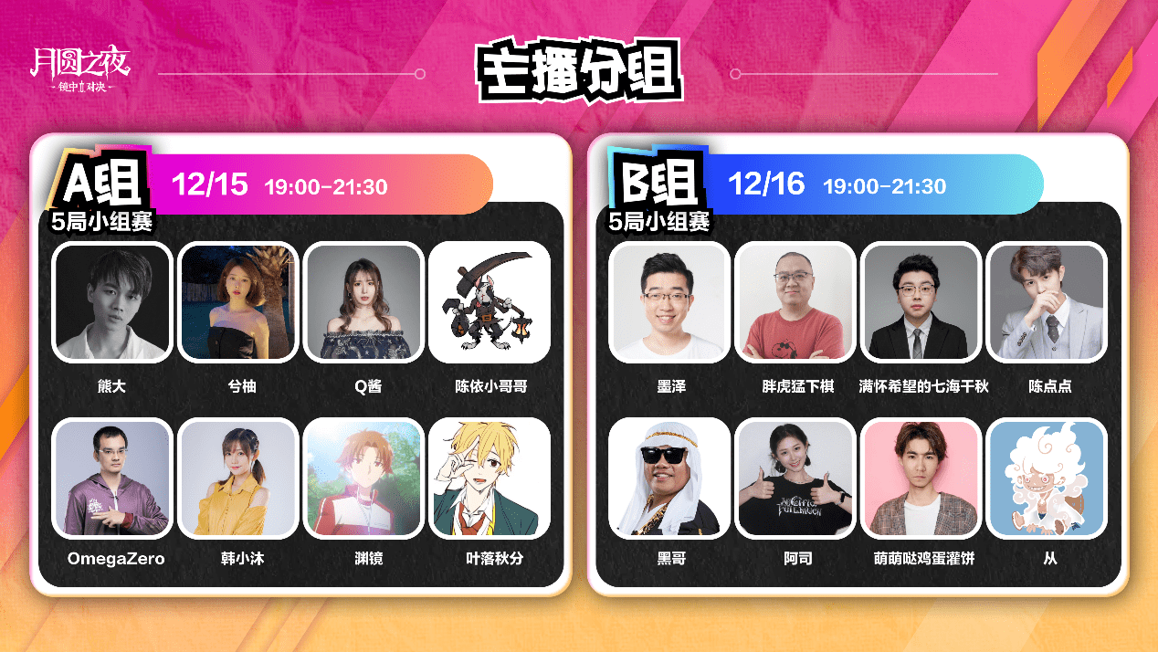 本次活动《月圆之夜》在抖音、B站、斗鱼三个直播平台分别邀请共计十六名热爱镜中对决的顶流主播,他们将分为两组进行为期三天的精彩对决!团聚切磋,共聚一堂,顶流主播相互过招,给所有观众带来一场镜中对决的顶级盛宴!