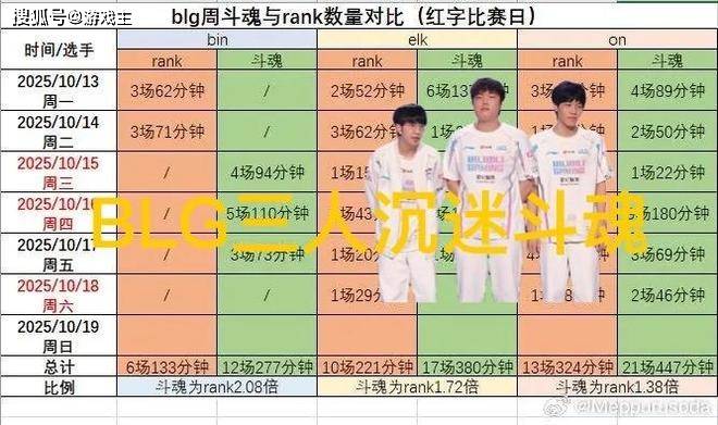 首先是上单选手bin,最近一周的rank数量为六场,一共是133分钟,斗魂进行了12场,为277分钟,直接达到了2.08倍。其次就是AD的elk,训练了十场,共221分钟,斗魂进行了17场共380分钟。辅助的on训练了13场,一共324分钟,斗魂进行了21场为447分钟。尤其是辅助的on,在和g2战队开赛的前三个小时,竟然还在进行斗魂竞技场,当时gen战队输给kt战队的时候,也是全员沉迷斗魂竞技场。