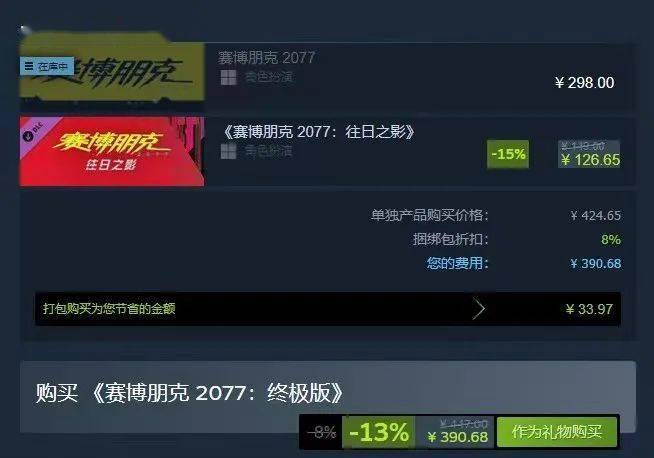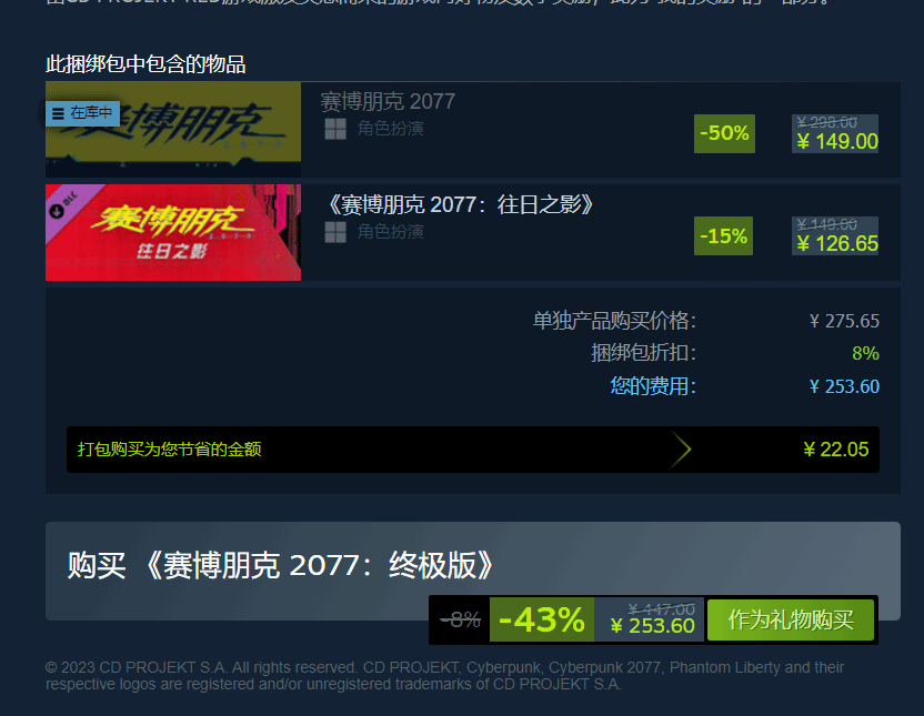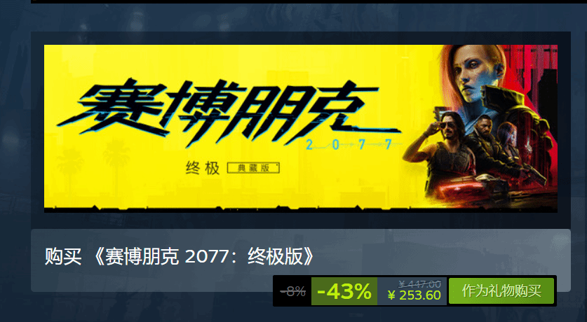 但目前《赛博朋克2077》本体开启了降价促销,来到了50%优惠的史低价格,这样终极版就降价到了253元,玩家就可以体验本体加上《往日之影》拓展包的全部内容。