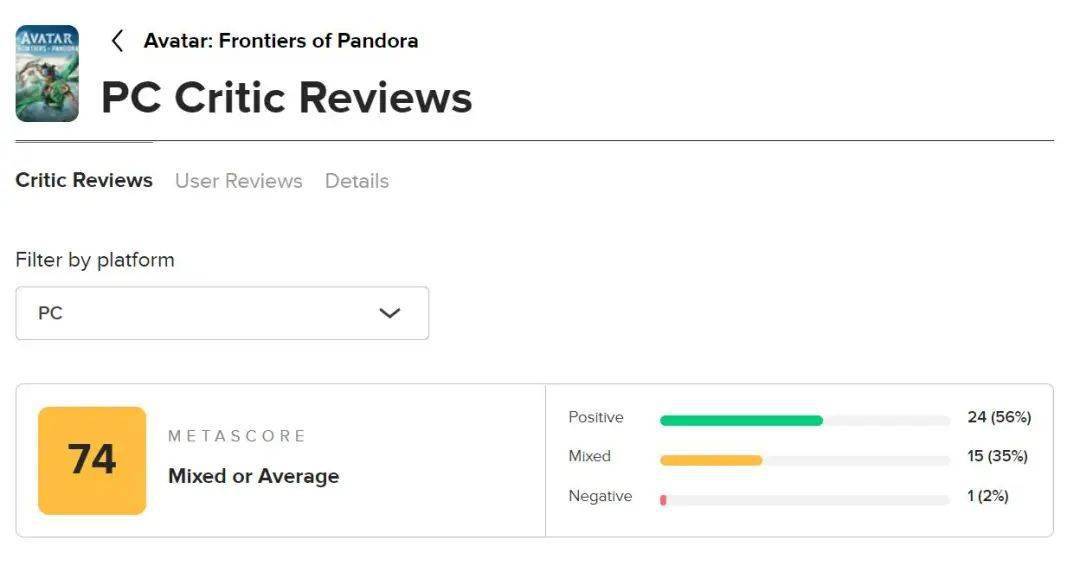 据电影改编的育碧新游戏《阿凡达:潘多拉边境》游戏媒体评分现在已经解锁,目前本作PC版在M站的媒体均分为74分(满分100分),共计43家媒体24家给出好评,15家中评,1家差评,还有三家评分待定。外媒IGN给出70分,GameSpot给出80分。