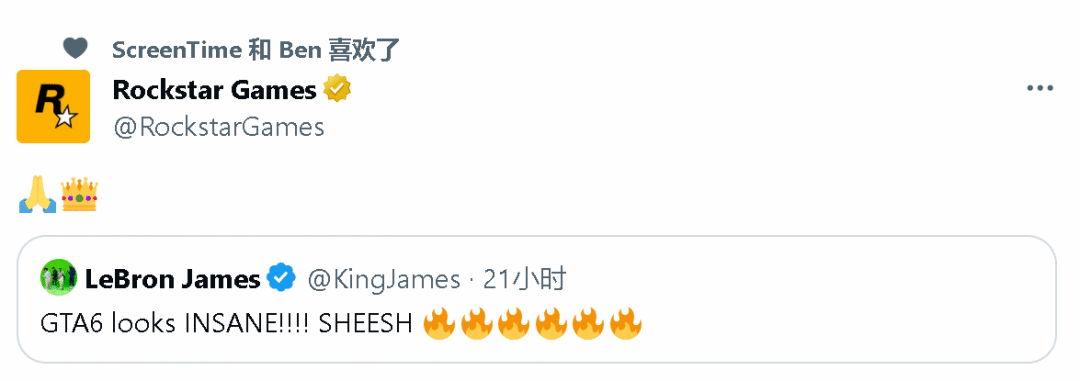 NBA湖人队球星勒布朗·詹姆斯就在近日发文表示“《GTA6》看起来太疯狂!太令人惊讶了”,而R星官推也向詹皇回复了表情以示感谢。