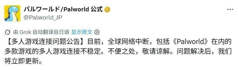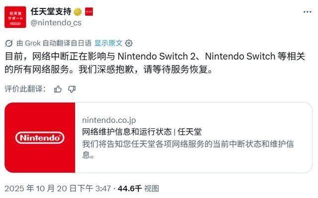 截至本文发稿时,任天堂报告称,Nintendo Switch 2、Nintendo Switch等设备的网络服务全面出现网络故障。此外,部分面向iOS和Android平台的任天堂智能手机应用程序也发生了网络连接问题。任天堂已就此致歉,并表示完全恢复可能需要一些时间。另外,《幻兽帕鲁》的官方社交媒体账户也报告称,包括该作在内的多款游戏均出现多人联机模式连接不稳定的情况。