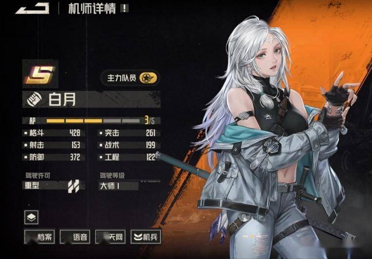 当然,硬核的战斗要有,精彩的人设自然也是不可或缺。游戏中有着各位性格鲜明且个性十足的机师,尤其游戏中我最喜欢的机师白月,在立绘中她身着帅气值拉满的紧身牛仔裤,而上身则身着火辣的黑色背心加工装外套,白色的长发更是让这个角色看起来“机师范”十足,颇有种酷姐头的风格,但在实际游戏中,她的性格却十分温柔,这种反差也让被这个角色所深深吸引,我也因此将其设置为了我的主力机师。