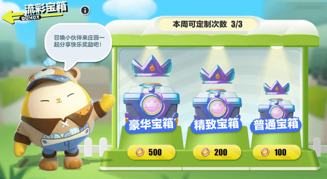 除了藏宝箱外,还有全新推出的流彩宝箱!从12月7日开始,蛋仔们可以在庄园内獭獭蛋处,消耗蛋币生成不同等级的流彩宝箱。流彩宝箱内容为彩虹币、许愿币和潮流纤维。蛋仔们还可以化身派对福利官,在宝箱内添加自定义奖励,并写下寄语。