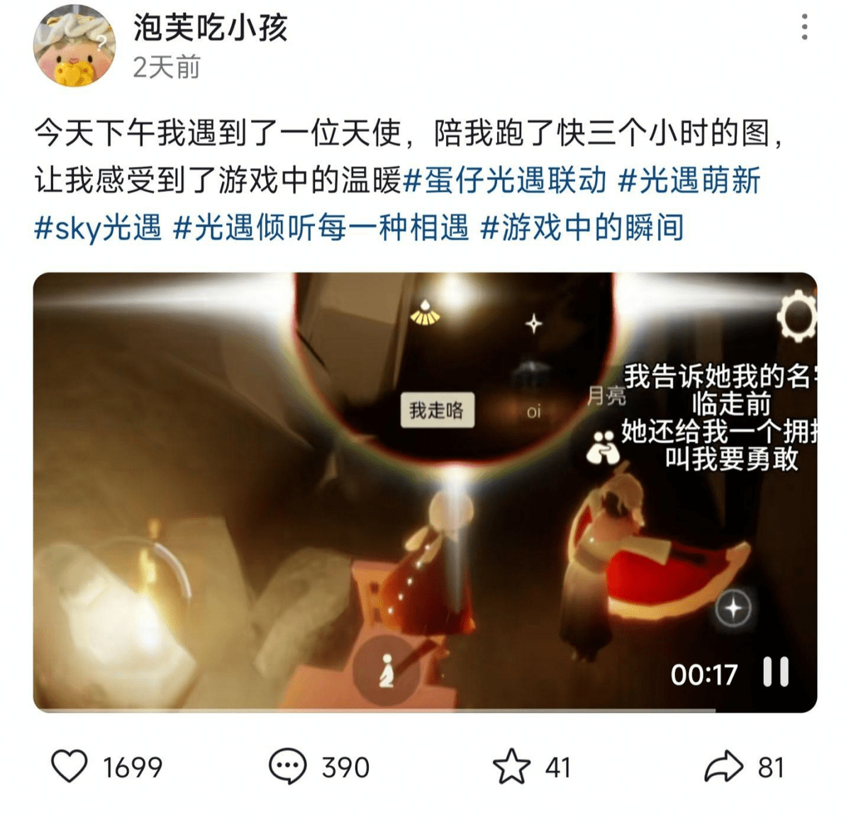 甚至于还涌现了一批趣味的短视频热词,如「在光遇遇到了心软的神」、「光遇玩家略微出手蛋仔恋爱脑」,展现了内容生态交融下的玩家情感流动,进一步推动此次联动的破圈效应。