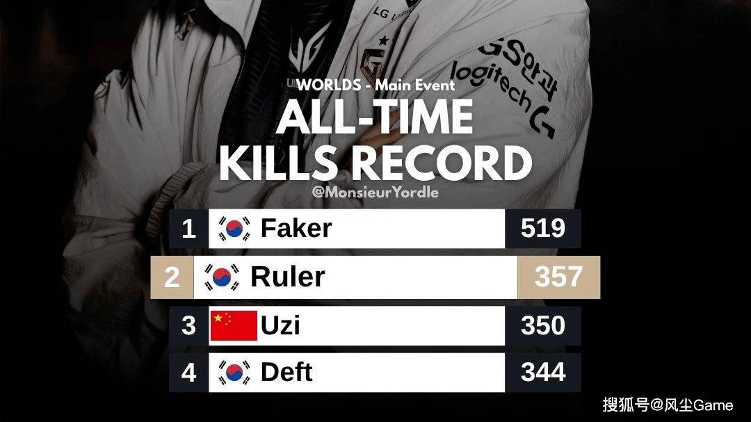 第三轮瑞士轮结束之后,拳头更新了全球总决赛,正赛击杀榜单,Faker依旧是断崖式领先,总击杀数,目前已经来到519了,而原本排第二的Uzi,被Ruler反超,下降到第三名,尺帝现在成了Faker之下的历史第二人,排在第四的还是Deft,乌兹都退役这么久了,还在前三,确实很能杀啊。