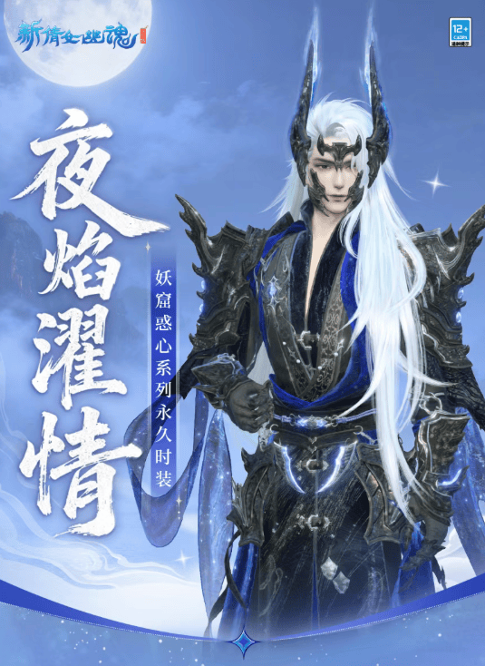 与女款不同的是,男款的【夜焰濯情】主走霸气路线,以《葫芦兄弟》动画中蝎子精霸气的铠甲为灵感设计了一套甲胄风的时装。一身玄色重甲搭配银白色的长发可以说是相当飘逸,蓝色内衬点缀其中形成了绝佳的色调平衡。