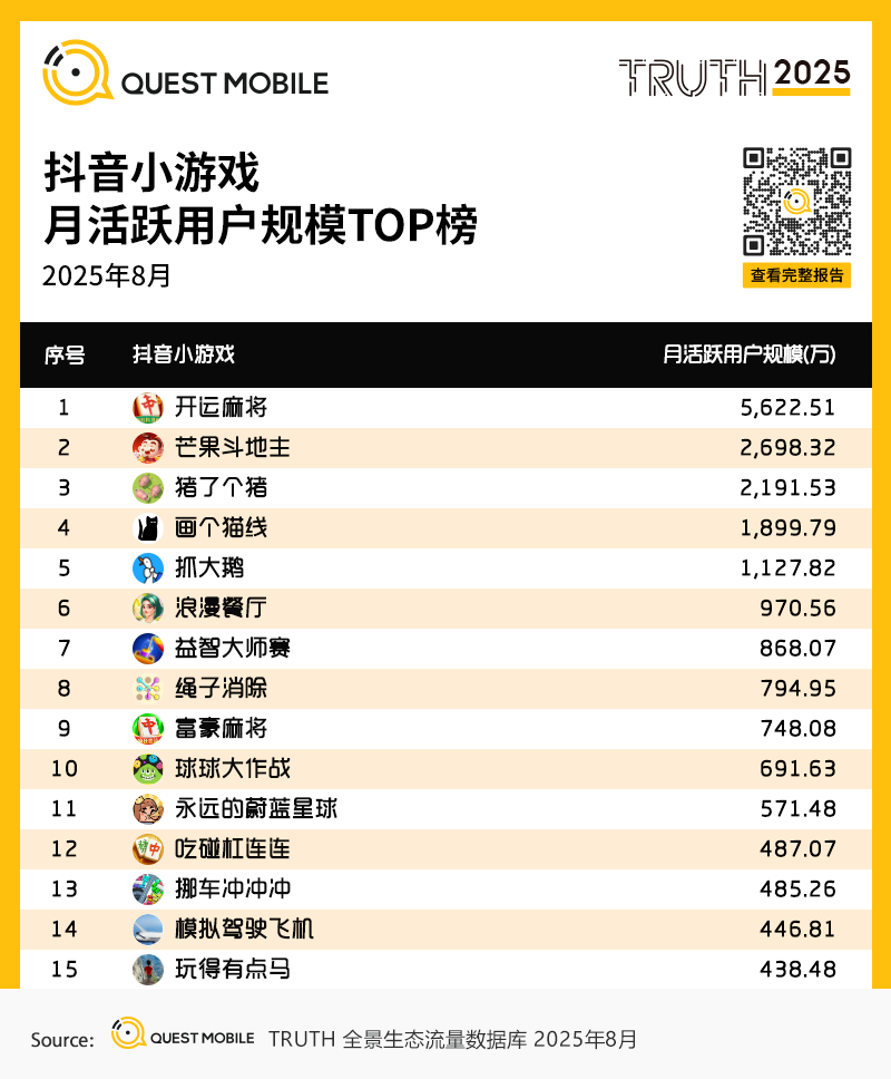 抖音小游戏则依托短视频生态,形成“内容种草—即点即玩—社交裂变”的闭环转化路径 。棋牌与益智类表现突出,《开运麻将》月活达5623万,《芒果斗地主》《猪了个猪》等产品月活也均超千万,显示出短视频平台在游戏分发与用户转化上的高效能力。