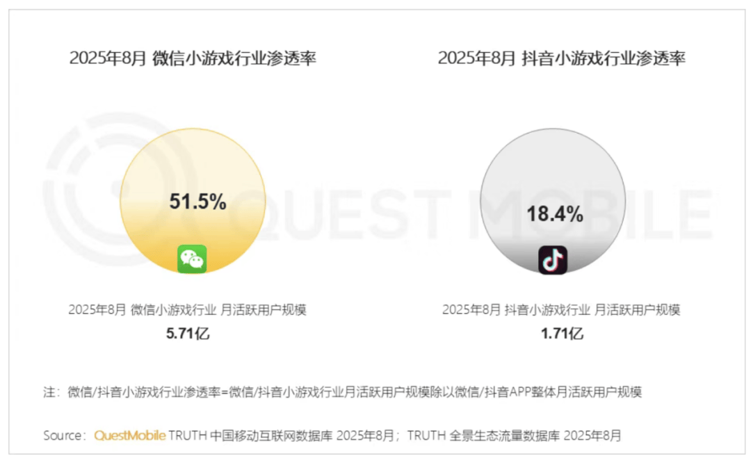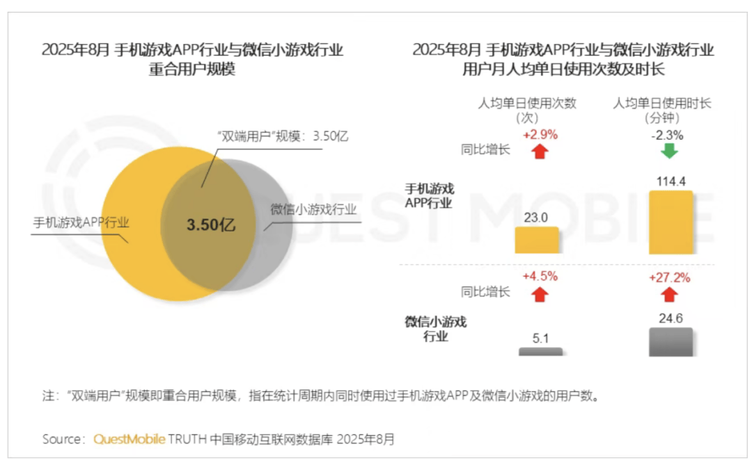 值得注意的是,小游戏生态快速崛起,与手游形成“双端互补”格局。其中,微信小游戏以51.5%的渗透率和5.71亿月活用户领跑,抖音小游戏则以18.4%的渗透率和1.71亿月活紧随其后。两者与手游用户重合规模达3.5亿,显示出手游与小游戏在用户使用场景上的高度协同。