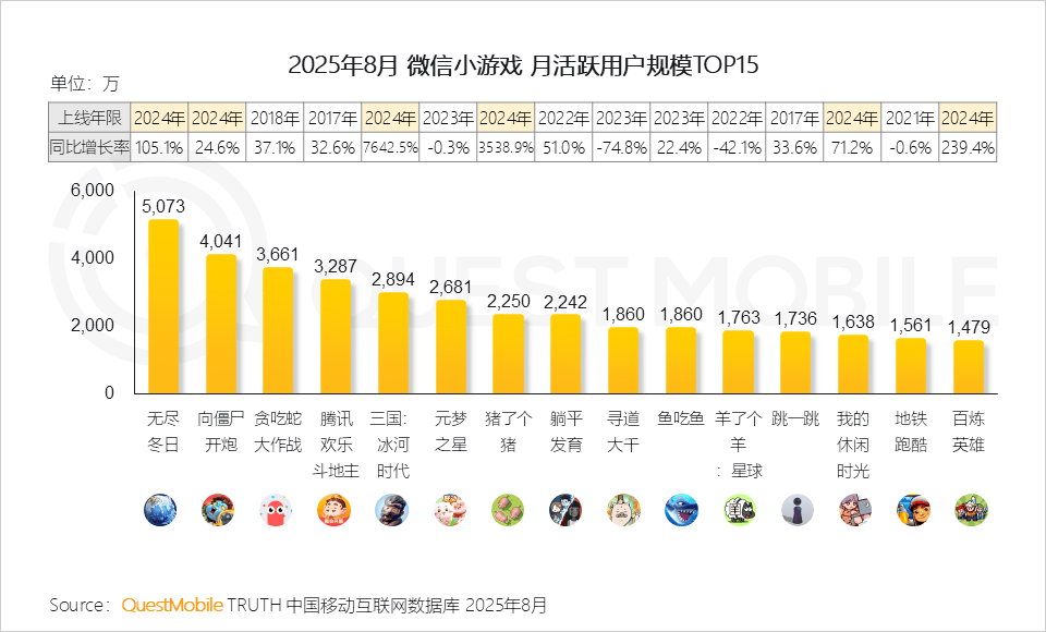 老牌产品如《贪吃蛇大作战》《跳一跳》依旧保持千万级月活, 而《无尽冬日》(月5073万)《向僵尸开炮》(月活4041万)《三国:冰河时代》(月活3661万)等新作则通过融合轻度休闲与中重度玩法 ,实现用户规模快速提升,反映出“中度化玩法”正成为微信小游戏增长的关键引擎。