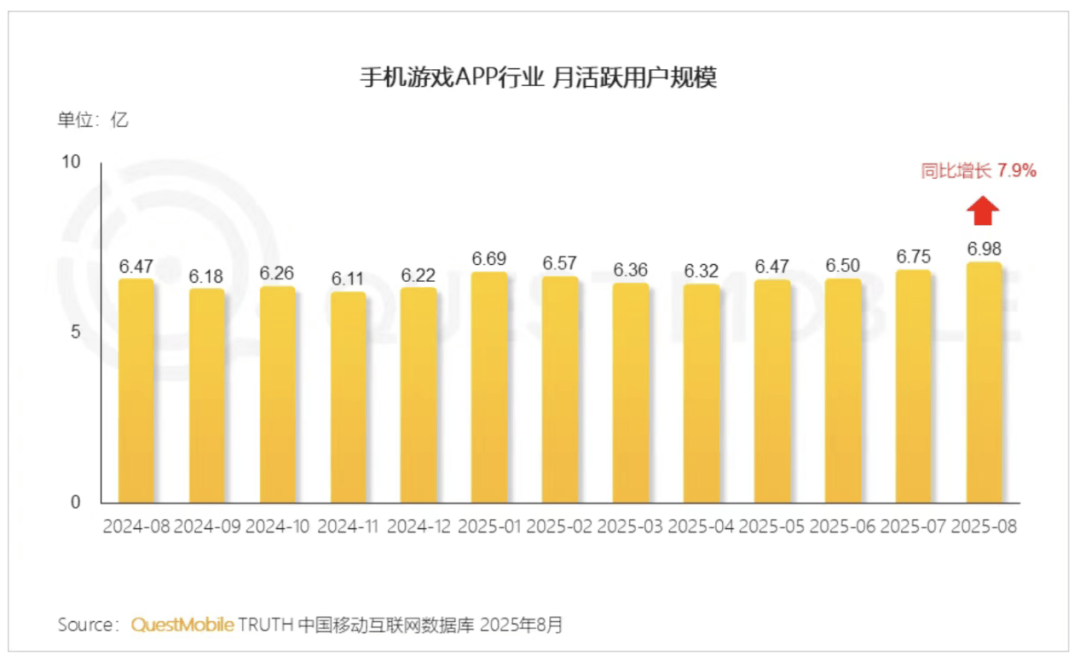 QuestMobile数据显示,截止到2025年8月,国产游戏版号过审数量达1050个,同比增长23.5%,行业精品化与高质量发展趋势明显。在此背景下,手游月活跃用户规模攀升至6.98亿,创下近一年新高。