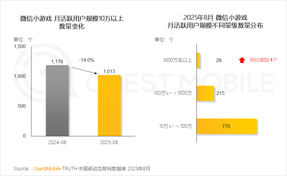 微信小游戏市场在竞争加剧的同时,结构持续优化。千万级月活产品增至28款,十万级产品成为中坚力量, 显示出市场仍为中小开发者留有空间。