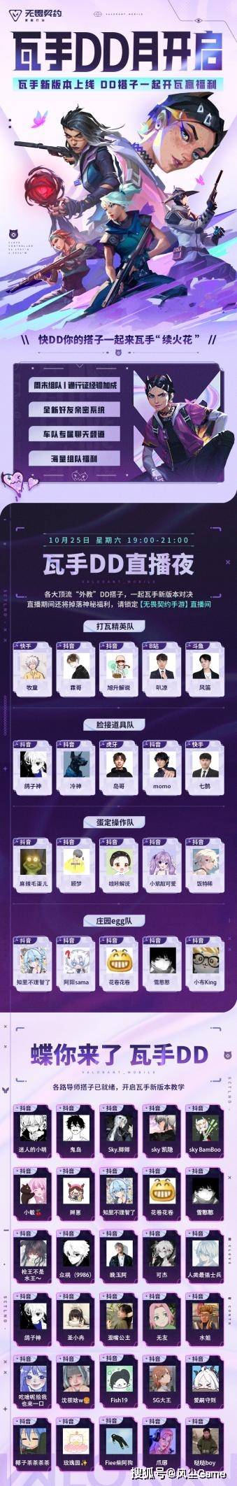 为了庆祝新版本的上线,10月25日晚间,“瓦手DD夜”直播活动将同步来袭。牧童、鸽子神等各大平台的头部主播将同台竞技,展开幕蝶vs黑梦的精彩PK直播。玩家们不仅可以欣赏到高水平的对决,还能参与互动,赢取海量惊喜福利。更多活动详情,请关注《无畏契约手游》官方咨询。