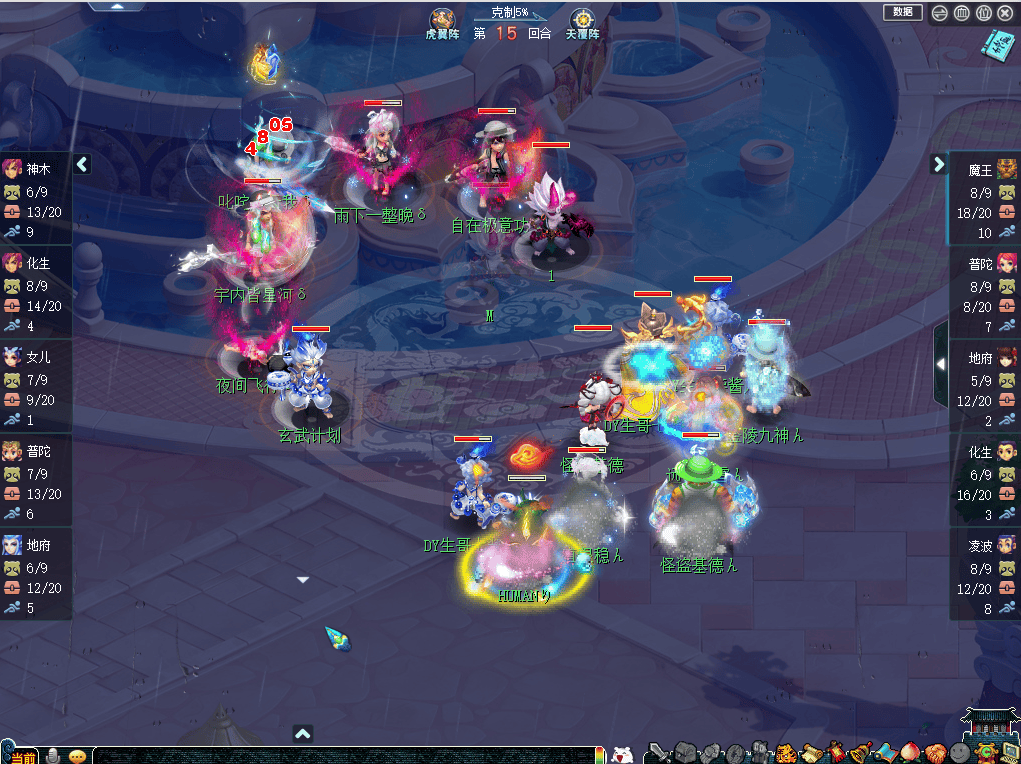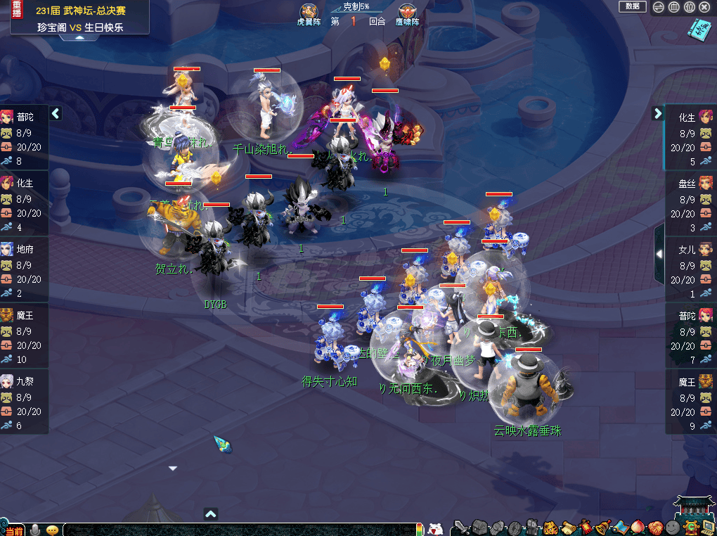 武神坛16进8,珍宝阁(观战方)与生日快乐(对战方)相遇。阵容方面,生日快乐选用了“力普陀、化生、地府、魔王、九黎”组成的“三攻”体系;珍宝阁则继续沿用了自己最为稳妥的“化生、盘丝、女儿、咒师普陀、魔王”组成的“四保一”体系。