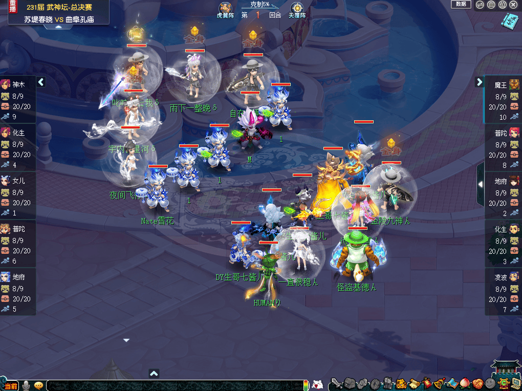 武神坛半决赛,苏堤春晓(观战方)与曲阜孔庙(对战方)相遇。苏堤春晓选用了“魔王、力普陀、地府、化生、凌波”组成的“三攻”阵容,曲阜孔庙则选用了“神木、化生、女儿、咒师普陀、地府”组成的“四保一”阵容。