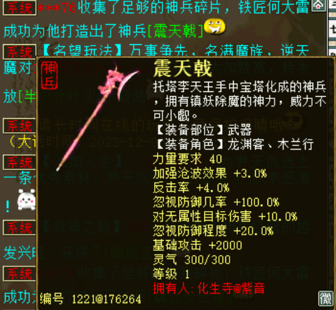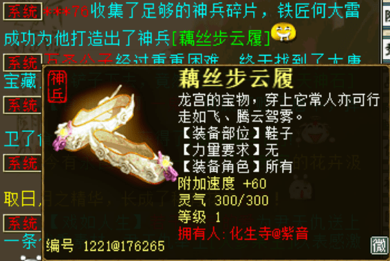 2、玩家找何大雷用碎片连换神兵,结果分别换到了沧波破震天戟和藕丝步云履,其实看到藕丝就够了,运气十足。