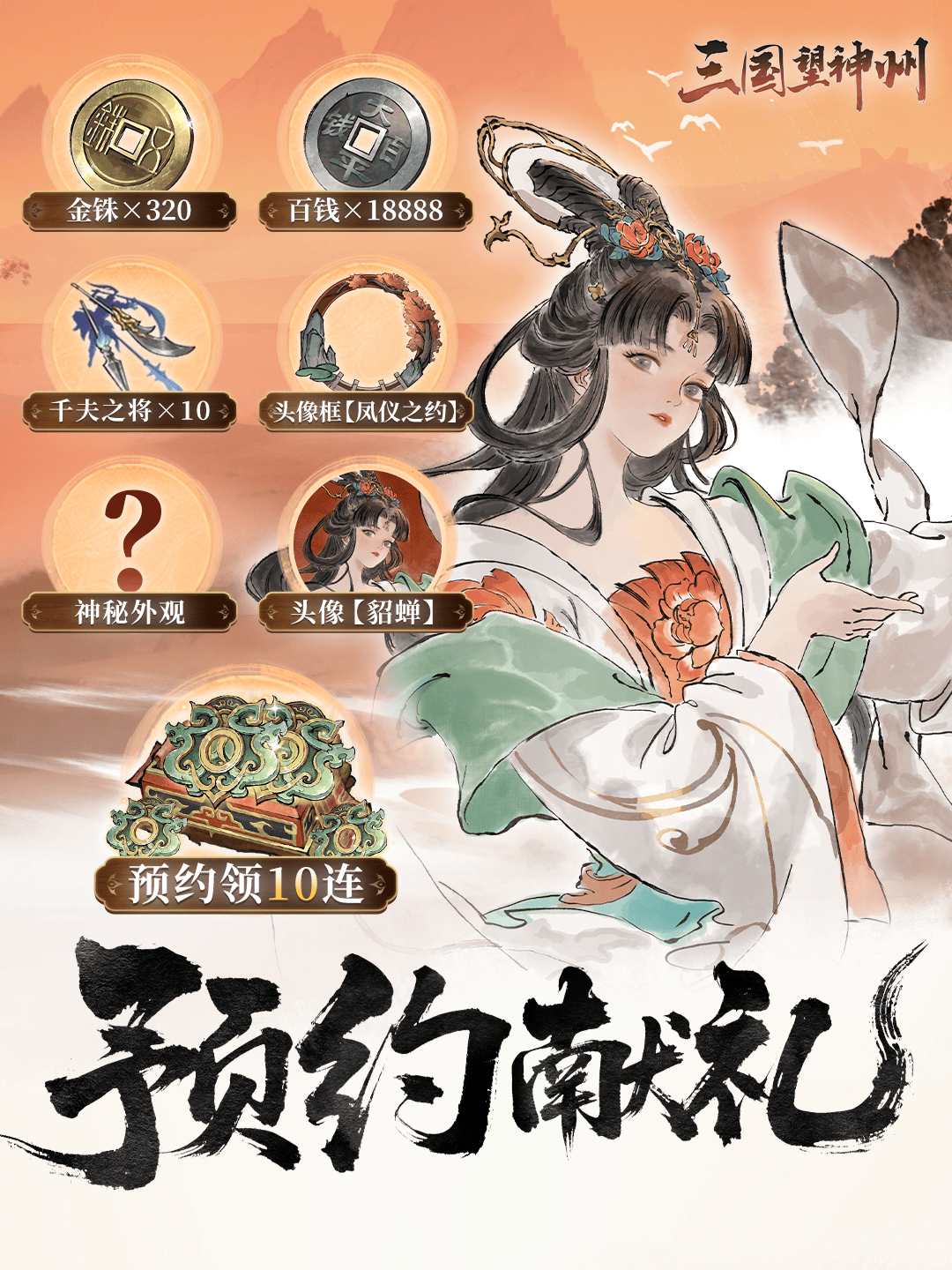 随着10月23日公测日期的临近,《三国望神州》官网已开启预约通道,玩家可领取包含金铢、头像、神秘外观在内的预约福利。