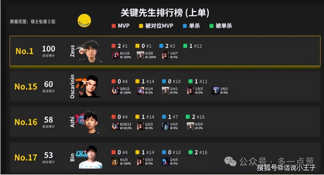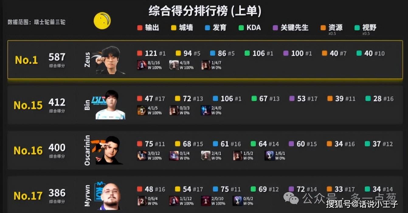 在视野排行榜中,这里面包含分均视野,分均插眼,分均真眼,分均排眼。Bin的数据各项都是比较差的,他只能排名16。在关键先生中,这其中包含mvp,对位mvp,单杀和被单杀。在这里面Bin直接沦为垫底,成为真正的17强上单。但是在发育排行榜中,这里面包含分均补刀,对位经济差分均经济和场均镀层。结果Bin直接排名第一,各项数据大幅领先,其他上单选手。在资源排行榜中,Bin的排名是11,这个排名其实还是有点低的。在输出排行榜中,Bin又成为了垫底,排名17,排名第一的则是宙斯。最后就是综合排名了,在这里面Bin可以说是真正的沦为了15强上单,宙斯还是排名第一,可以说他才是真正的第一上单。