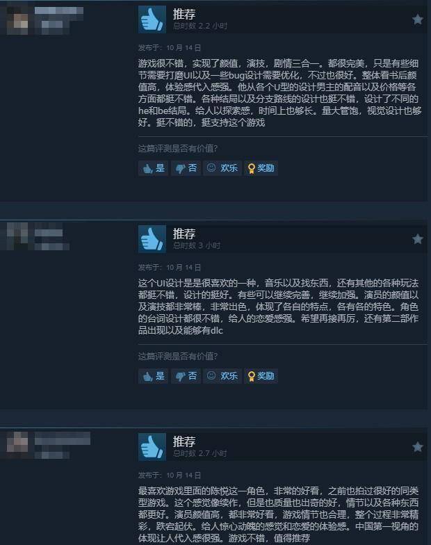 给予好评的玩家认为,本作实现了颜值,演技,剧情三合一,游戏剧情量大管饱,多种路线和不同结局让玩家探索欲很强。美女都很好看,颜值很高各有特点,角色的台词设计都很不错,给人的恋爱感强。