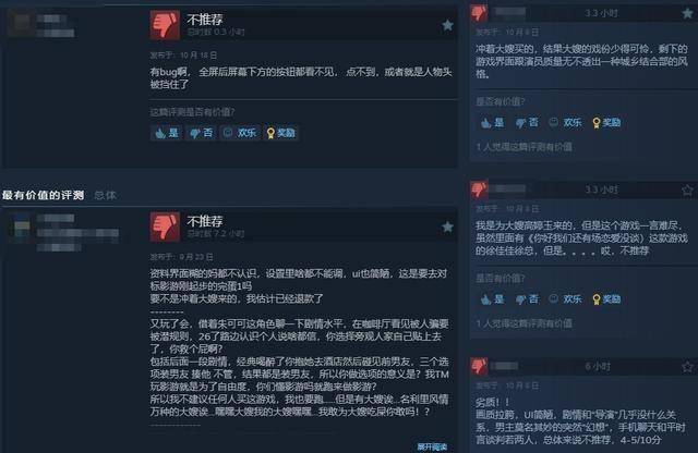 给予差评的玩家认为,冲着大嫂买的游戏,结果大嫂戏份少得可怜。游戏剧情拉跨,剪辑恶心。本作UI设计仍需打磨,一些Bug有待修复。