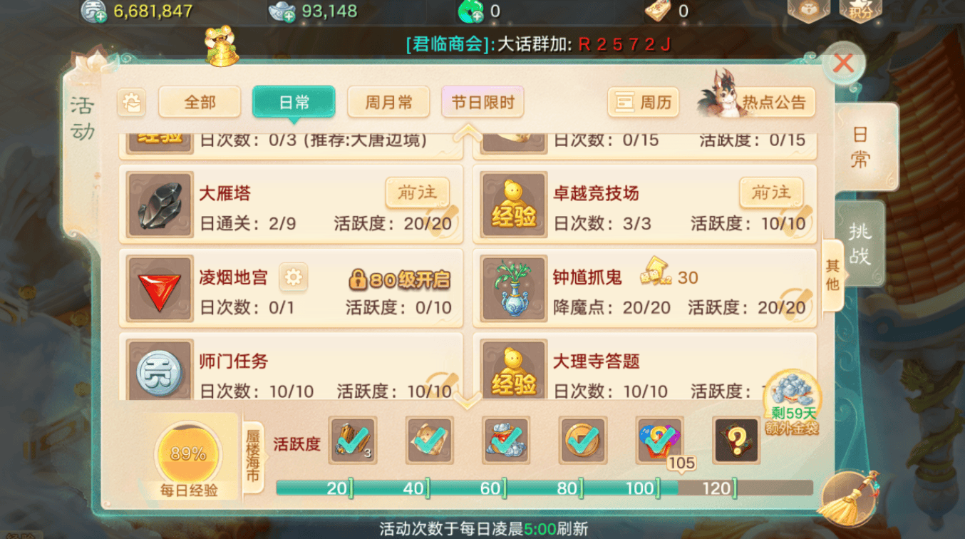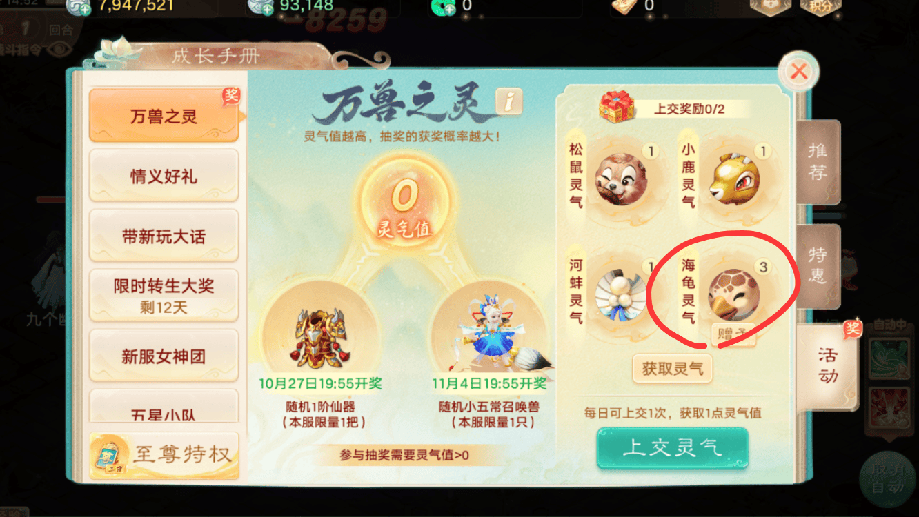 除了日常任务、副本活动,新区限时活动也可以参加一下,比如万兽之灵,世界频道有很多喊“松鼠换河蚌”、“松鼠换小鹿”、“海龟换松鼠”等等,可以根据自己需求交换一下,参与万兽之灵抽奖,有概率获得随机1阶仙器,或者随机小五常召唤兽。