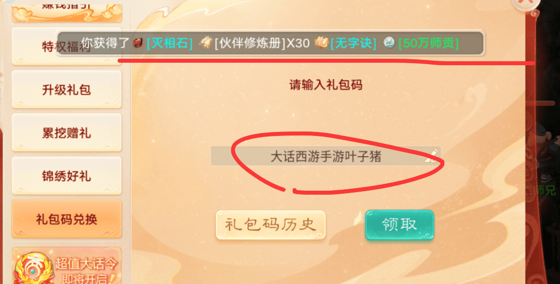 然后就是大话手游礼包,新区第一天可以激活使用,可获得大量师贡银两:没领过的可以用:大话西游手游叶子猪,主页面点击福利→礼包码兑换→输入【大话西游手游叶子猪】即可。