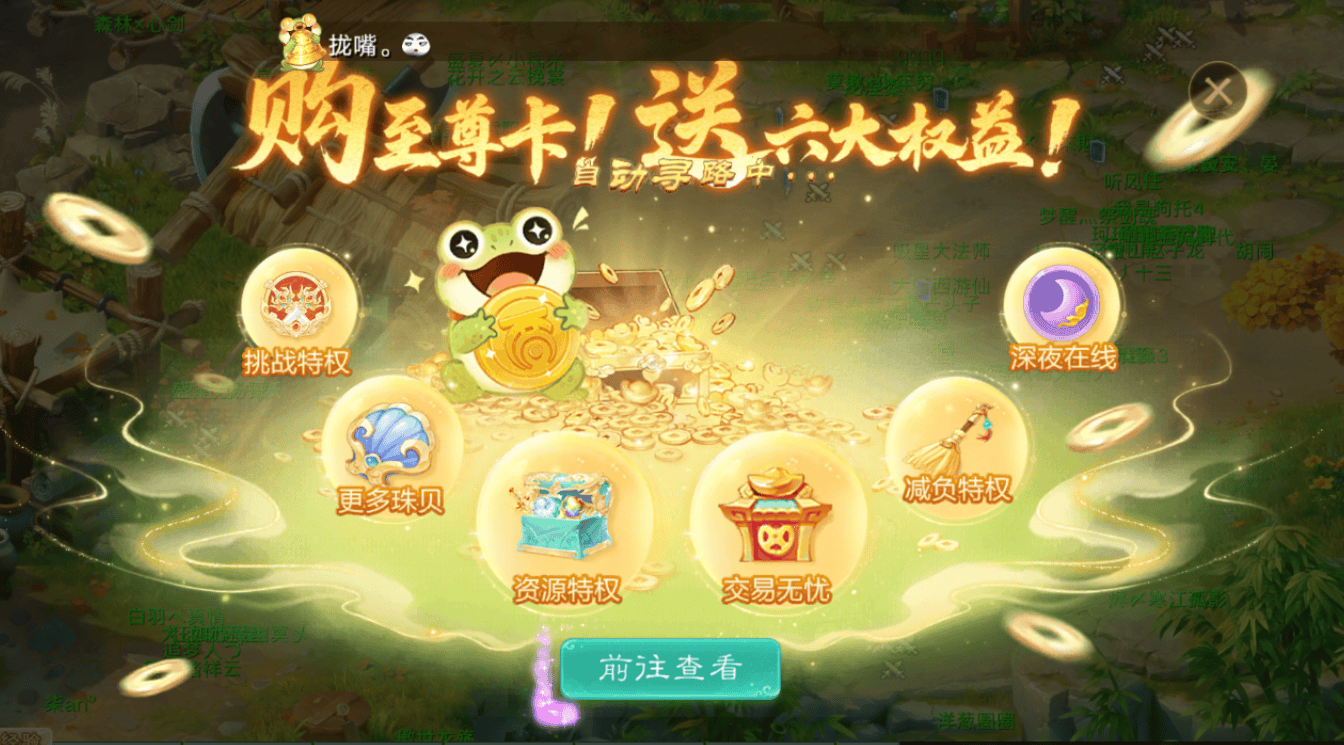 大话手游特权卡拥有六大权益,挑战特权、资源特权、减负特权、交易无忧、更多珠贝、深夜在线,比如激活特权卡师贡可以转变成银两,绑定道具变成非绑定,深夜八小时在线挂机,寄售上架位置也增加了。