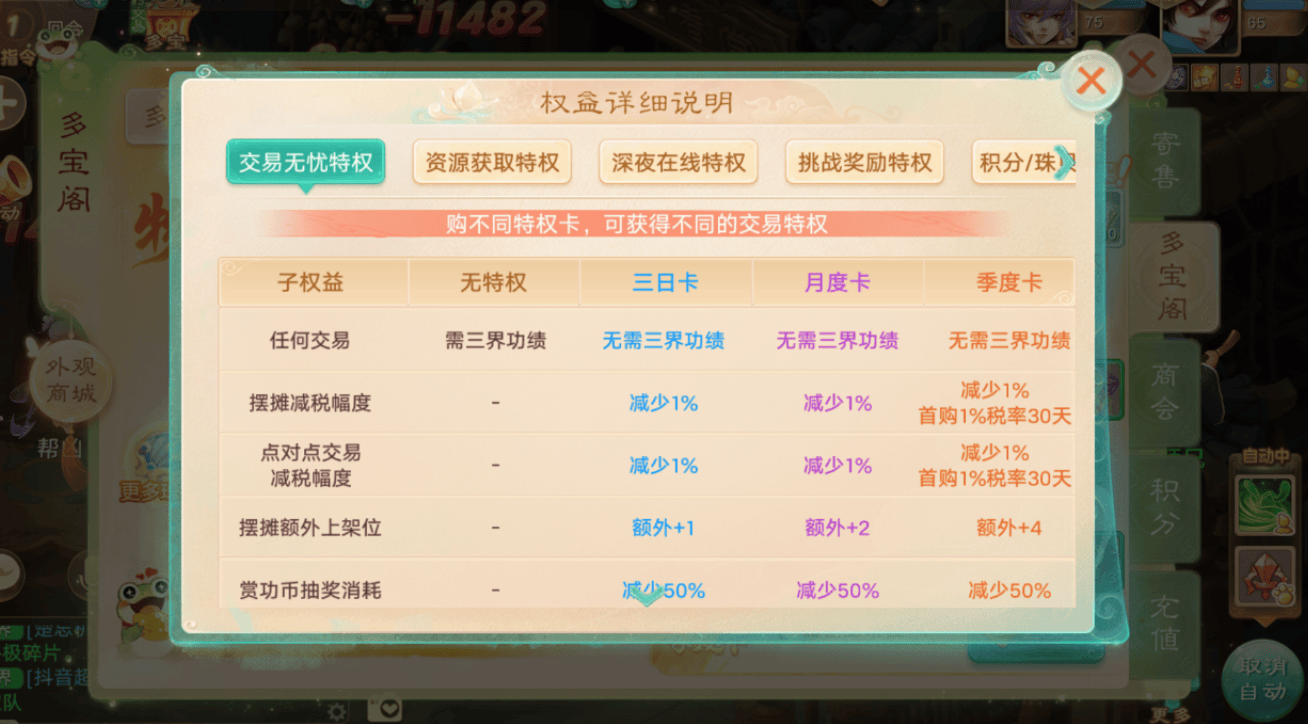 首次购买月卡/季卡至尊特权,赠送30天1%超低交易税权益;三日卡、月度卡、季度卡都是,有特权卡任务交易无需三界功绩,无特权卡则需要三界功绩。