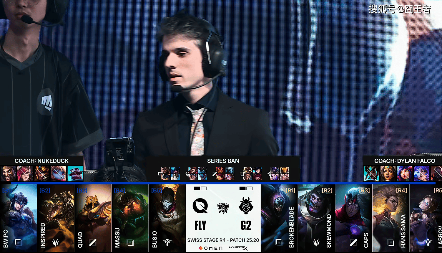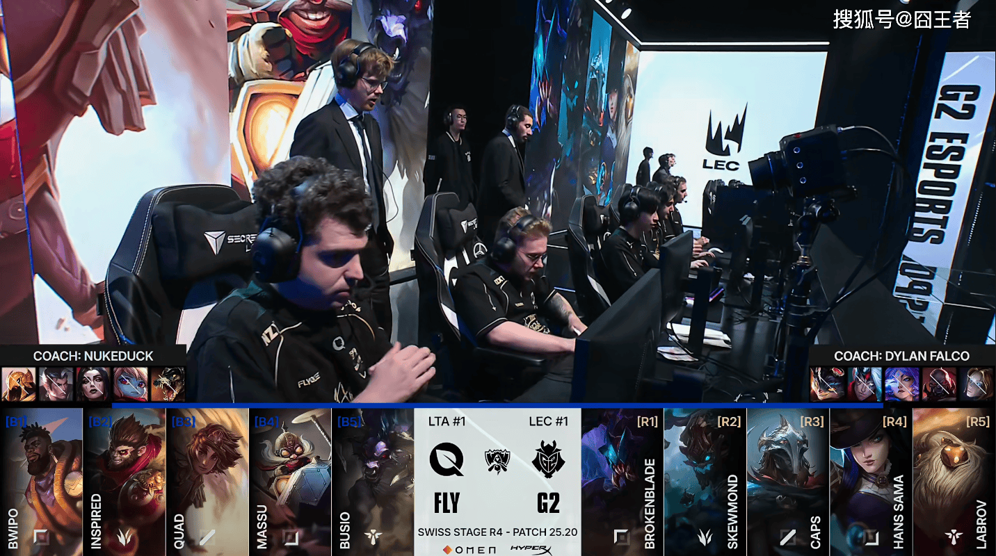 第一局比赛,FLY蓝色方,禁用:沙皇、赵信、妖姬、波比、鳄鱼,选用:Bwipo奎桑提、Inspired猴子、Quad岩雀、Massu飞机、Busio牛头;G2红色方,禁用:发条、塞恩、芸阿娜、韦鲁斯、兰博,选用:Brokenblade雷克塞、SkewMond大树、Caps维克托、Hans Sama女警、Labrov巴德