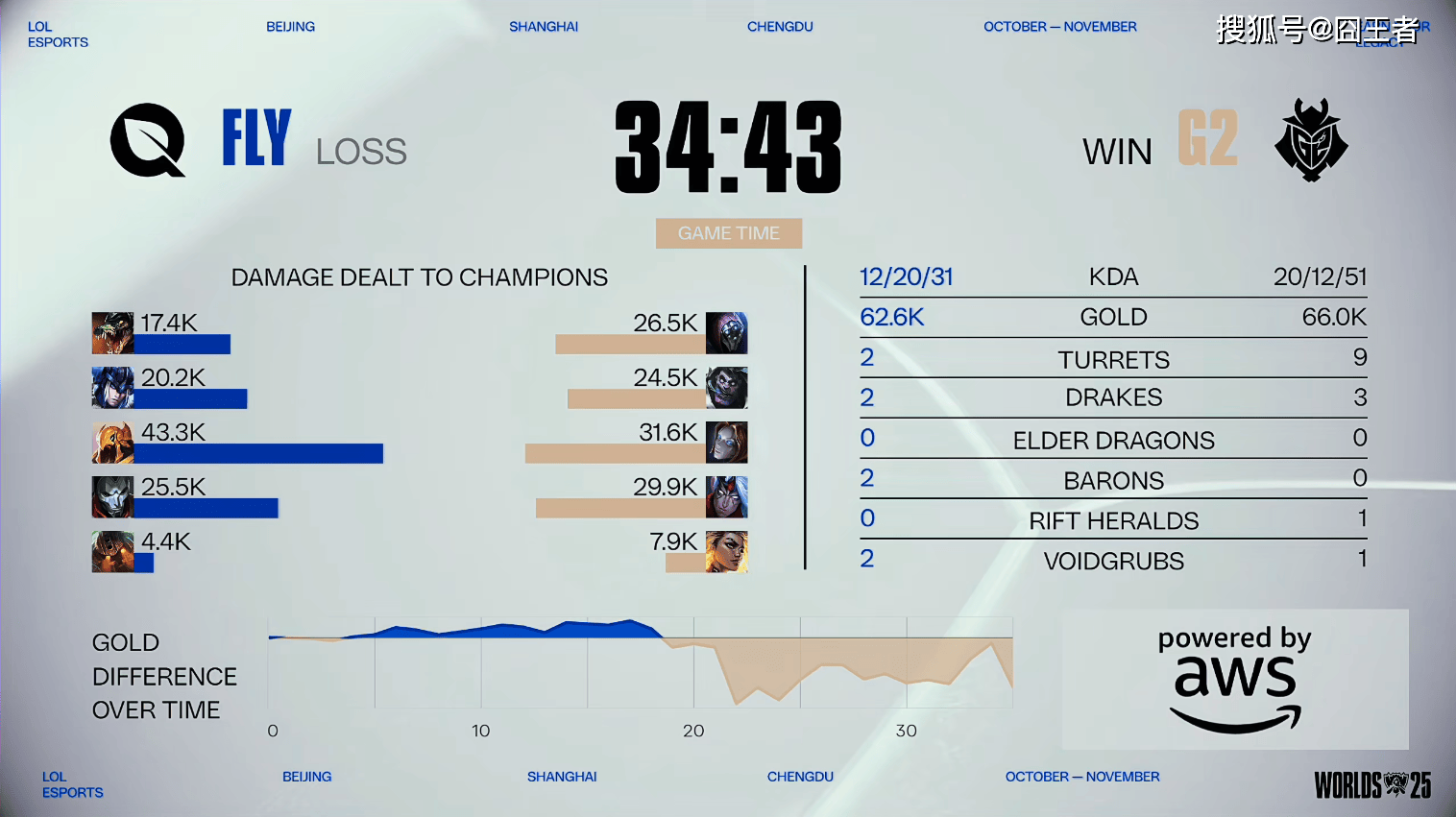 结果第三局比赛,FLY棋差一招,功亏一篑,和G2各打聊半场好局,G2笑到了最后。前20分钟,是FLY的好局,打出了经济优势;比赛第20分钟左右,SkewMond蒙多团战发力,G2打出0换4拿下厄塔汗;比赛第24分钟左右,Inspired瑟庄妮开到Hans Sama韦鲁斯,FLY打出1换2拿下大龙;比赛第32分钟左右,FLY中路抓到机会击杀SkewMond蒙多打出1换2拿下大龙;最终比赛第34分43秒,Bwipo鳄鱼率先被秒,Caps发条拉四个帮助G2打出1换4后直接一波。