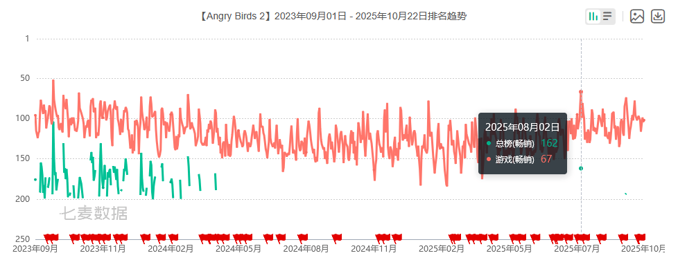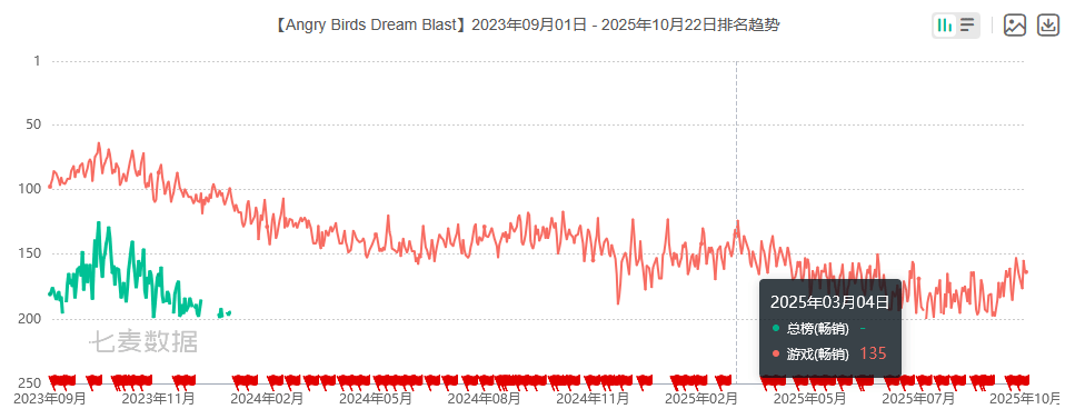 需要指出的是,《愤怒的小鸟:梦幻爆破(Angry Birds Dream Blast)》是一款消除玩法的休闲产品,从2018年上线算起,已经运营了7年时间。这款游戏近一年在美国iOS畅销榜上基本稳定在前200名以内,但相比前两年的排名的确表现出了下滑趋势。