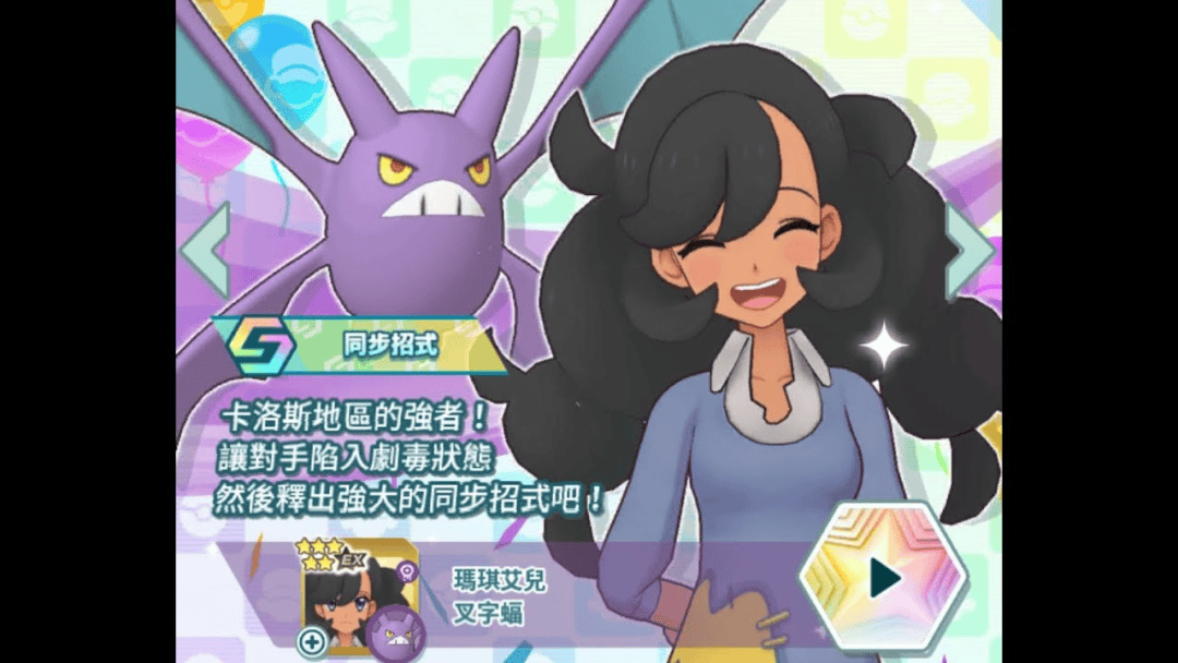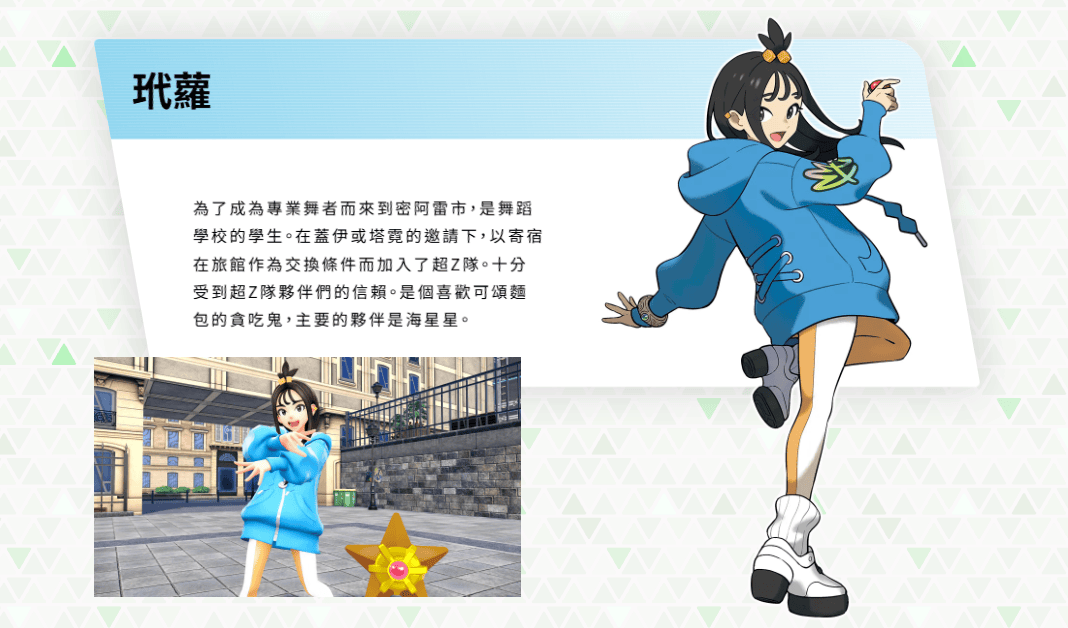 除了上面这个,GF这次也是明目张胆往里面塞了不少前代宝可梦的彩蛋,底下这个妹子叫玳萝,在剧情中可爱又有活力还有点天然呆,来密阿雷市是想成为像哥哥一样的优秀舞者。