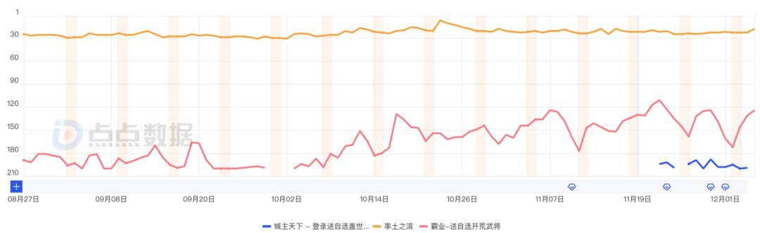 点点数据显示,截止至12月1日,在近90天时间里,《率土之滨》在iOS畅销榜中一直保持着较高的排名,位居赛道头部。腰部方面,三七互娱首款自研SLG《霸业》在近期也迎来提升,目前位居iOS畅销榜百名左右的位置。此外,三七代理、中手游首款自研SLG《城主天下》12月也在尝试冲榜。