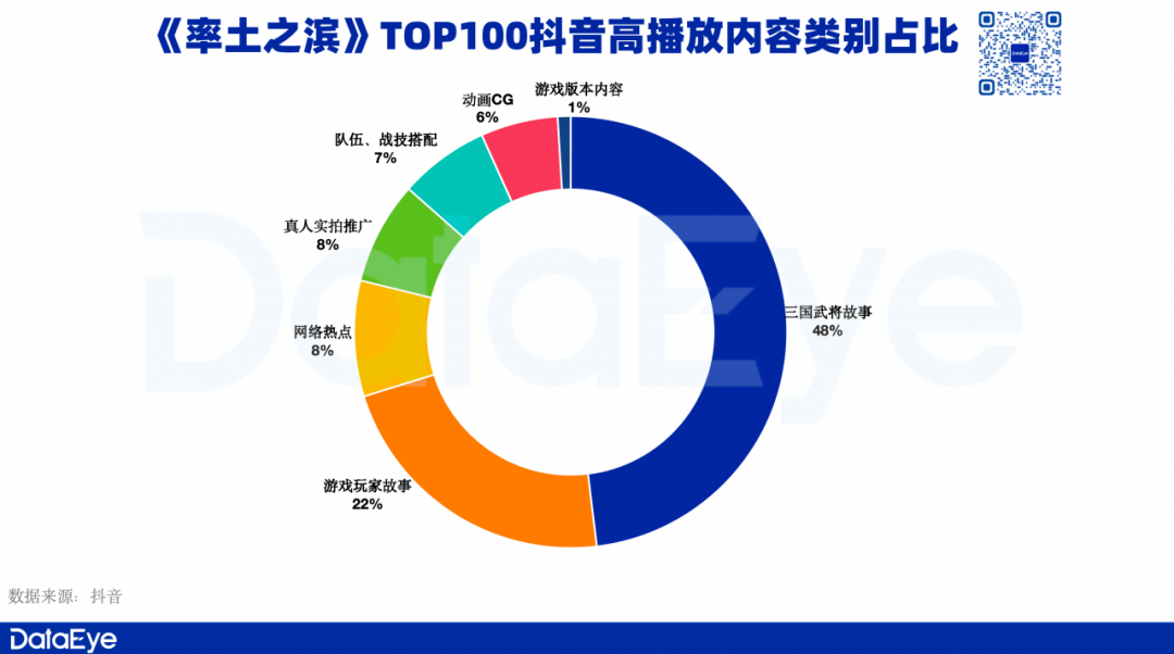 DataEye研究院统计,截至12月1号,《率土之滨》抖音Top100高播放量内容类别中,描述“三国武将故事”的占比达到48%,其次则是讲述“游戏玩家故事”的内容,占22%。