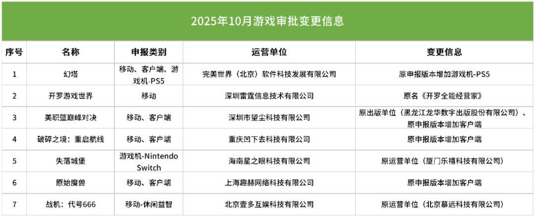 审批信息变更的产品主要包括:完美世界《幻塔》增报PS5版本、望尘科技《美职篮巅峰对决》增报客户端版本。