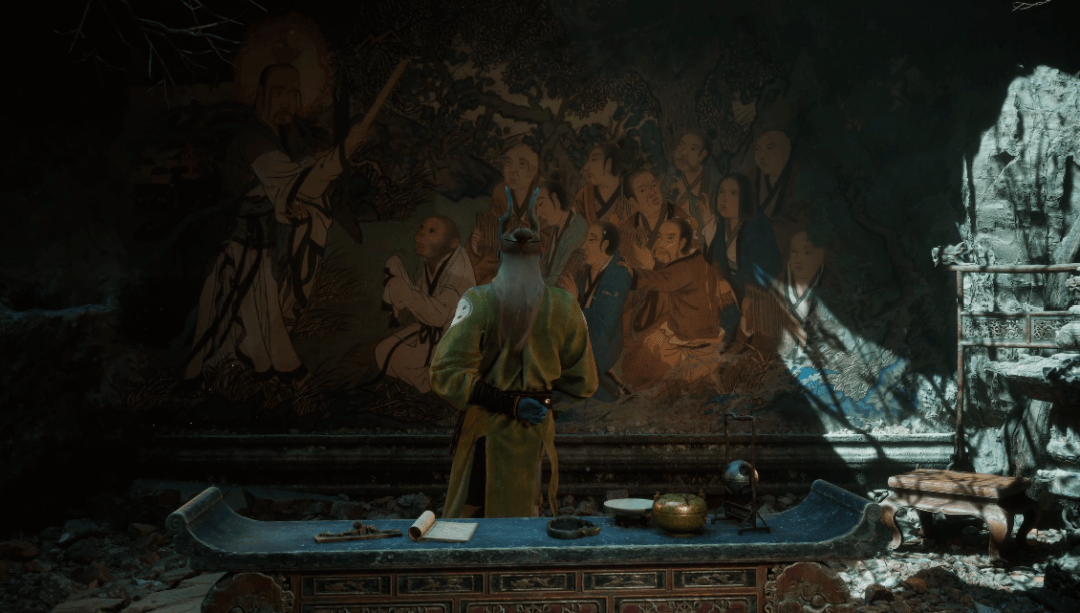 在视频最后,开头的壁画全貌终于得以展现,是孙悟空在菩提祖师求学时的事。而作画人的身份也值得玩味,他的两句台词:你,也想当神仙?这天命,你还想要吗?也暗示了他很有可能就是新一代玩家的师父。
