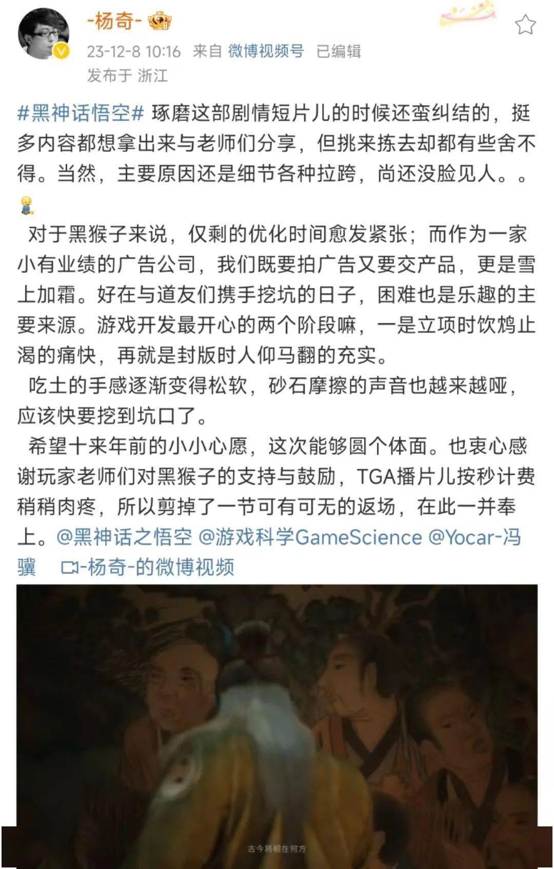 也就是说,只用再等8个月就可以玩到《黑神话:悟空》了。想到这,葡萄君难免会有点恍惚。毕竟从2020年首曝时的万众狂欢,到后两年的自嘲、玩梗与质疑,再到今年线下公开试玩的自我证明,游戏和我们都经历了太多。上午杨奇还发了条微博,感慨一路经历的坎坷: