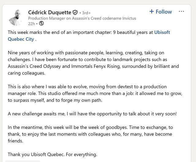 据悉,《刺客信条:Invictus》制作经理Cedrick Dequette日前领英上宣布离职,结束了他在育碧魁北克长达9年的工作生涯。