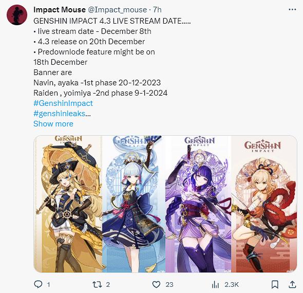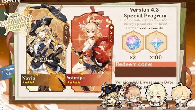 然后就是4.3的前瞻直播的大概时间会在12月8号也就是下周五晚8点开播,至于正式上线时间如果没有延迟的话正常会在12月20号上线,上半依旧是娜维娅和神里绫华,下半是雷电将军和宵宫,当然还有我们最期待的六星战神夏沃蕾了。