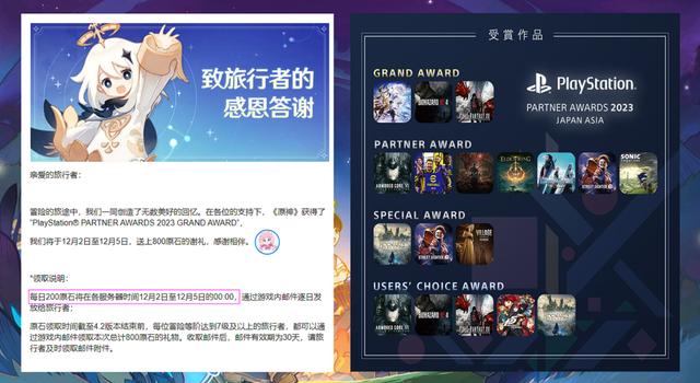 最后便是原神再次获得PS最佳游戏奖项,算上这次应该是第三年获奖了。为了表达玩家对原神的支持,官方决定发布800原石作为奖励送到玩家的邮箱中。