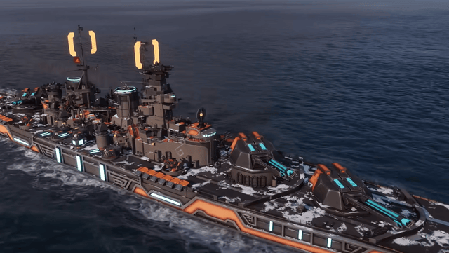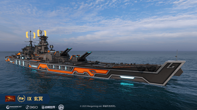 玄冥战列舰是一艘橙黑配色,有着刀锋状舰首设计,后倾舰桥线条简洁流畅,橙黑配色的涂装散发着威严感,主武器为电磁炮与激光反导系统,搭配反舰导弹发射装置,形成远近结合的火力体系。