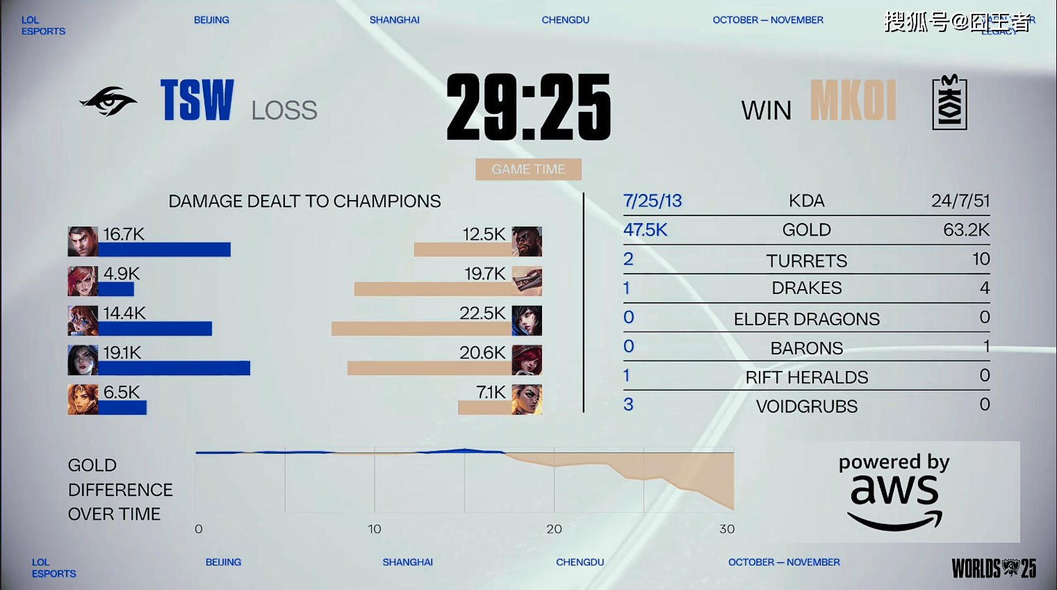 结果第三局比赛,又是被MKOI打成了碾压局。4分钟左右:蔚支援上路,但Myrwn奎桑提率先完成对位单杀双方打出1换1;12分钟左右:双方河道爆发团战,TSW最终击杀多人扳回一定劣势;17分钟左右:双方野区爆发团战,KOI战力更强打出0换3奠定优势;23分钟左右:Supa霞倒钩抢下厄塔汗,KOI团战摧枯拉朽打出ACE;26分钟左右:芮尔绕后开团,KOI利用优势再次赢下团战随后控下大龙;最终29分25秒,MKOI团灭TSW,赢下比赛。