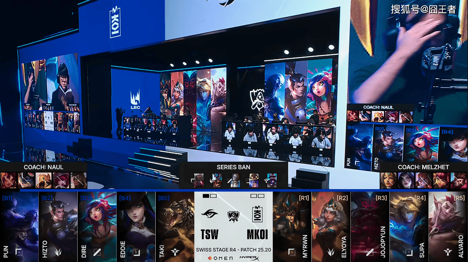第一局比赛,KOI蓝色方,禁用:阿萝拉、蔚、奇亚娜、安妮、猴子,选用:Myrwn安蓓萨、ELyoya巨魔、Jojopyun发条、Supa飞机、Alvaro布隆;TSW红色方,禁用:瑞兹、岩雀、沙皇、妮蔻、波比,选用:Hiro02赛恩、Hizto皇子、Dire加里奥、Eddie芸阿娜、Taki牛头