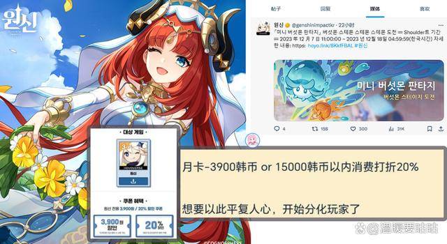 阿姬去查了一下原神韩国官方网站,这里面并没有三折月卡的消息。而通过其他人的图片来看,应该是韩国渠道三星商店里面打折。至于是真是假,有没有在韩国的小伙伴能提供图片来说一下呢。由于月卡打折也要花钱来买,隔壁那边并不接受,至于后续发展如何,我们躺平吃瓜就好了。