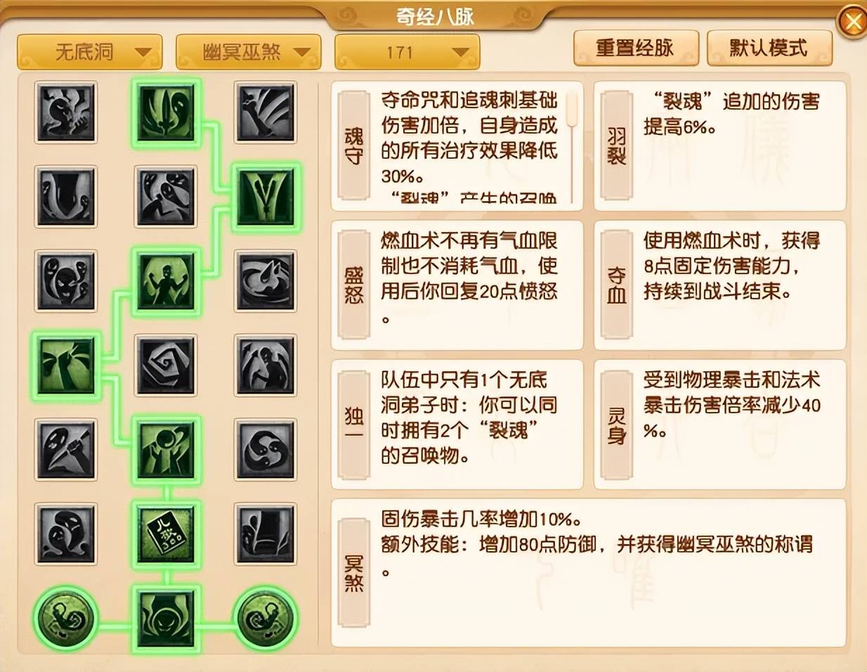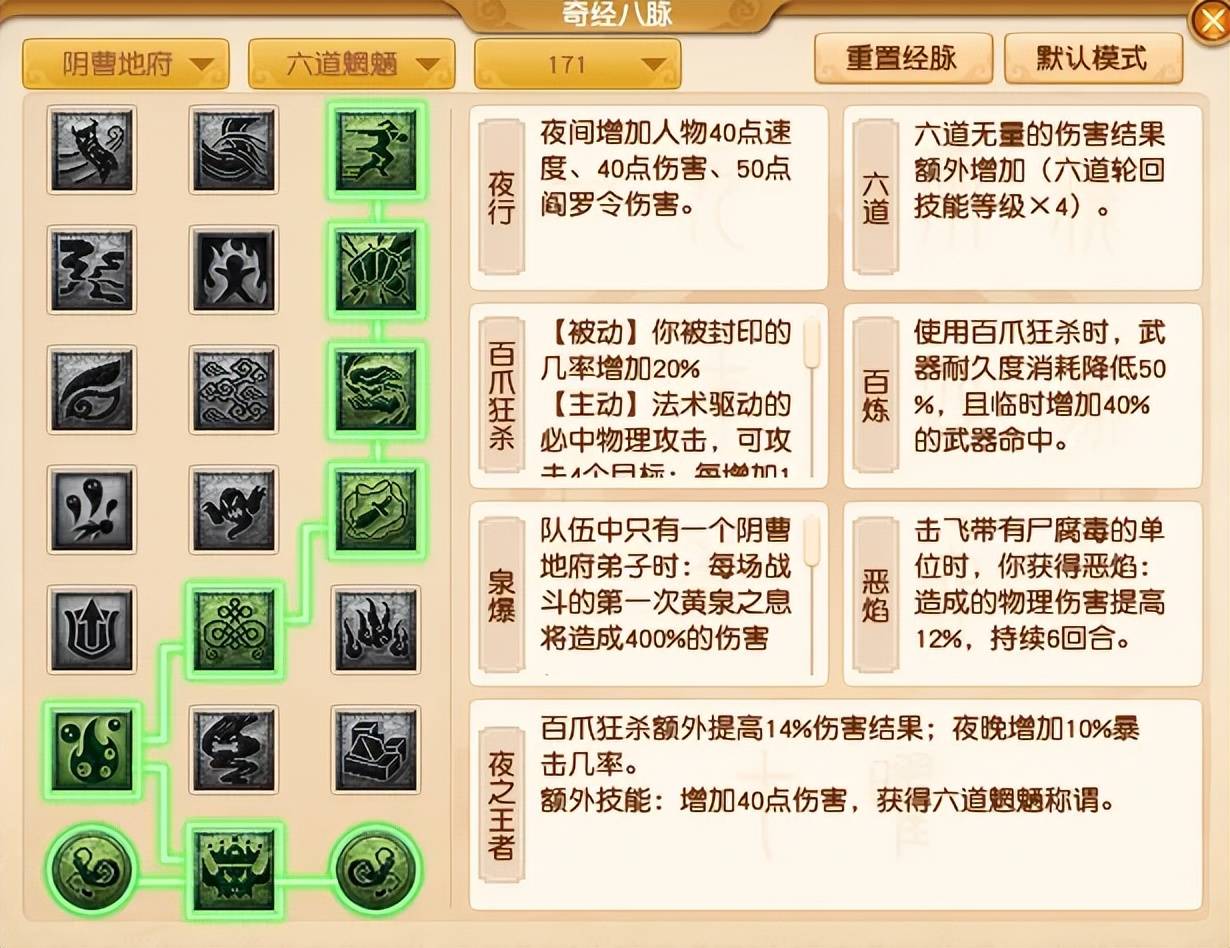 不过,主玩力地府的小伙伴也可以采用【六道魍魉】流派,经脉点法为“3333212”。这么点既可以提升夜间造成的伤害,还能起到降低武器耐久消耗的作用。