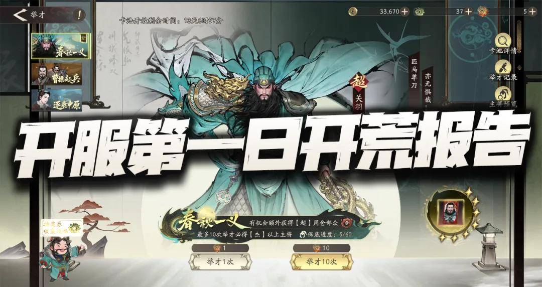 那针对这个池子维一个人建议大家还是可以抽一抽的,毕竟开服后的资源相对会稍多一些,能抽到关羽的话还是对我们的开荒有不小的帮助,但普通玩家最多就抽到一个关羽即可收手,没有必要硬拿200抽的周仓,因为后续还有一个限定池子张飞,其强度和关羽类似也可以达到T0,所以大家需要为张飞也提前预留一些资源。